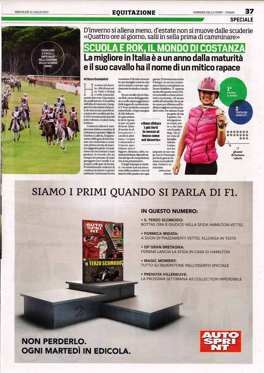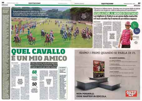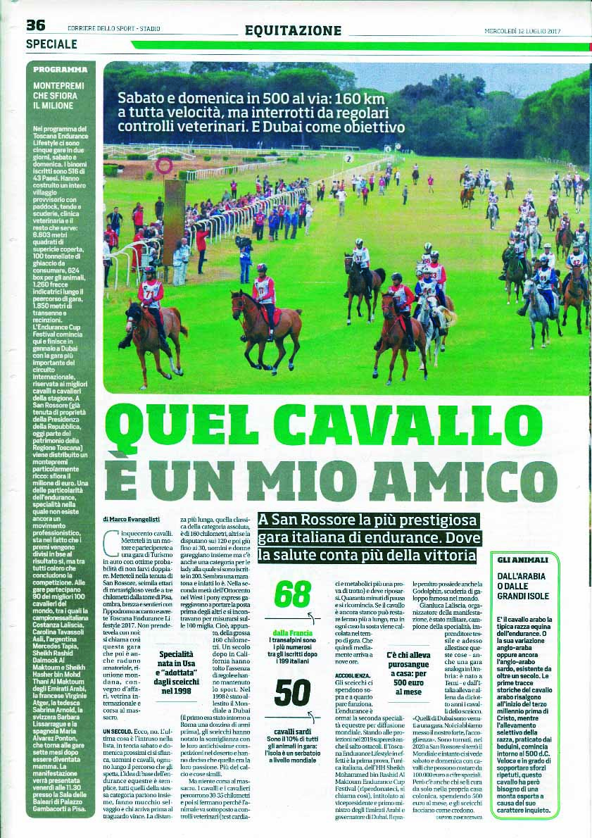 SAN ROSSORE - Tutto ciò che avreste voluto sapere e scoprire su Toscana Endurance Lifestyle è contenuto in due pagine di servizi e approfondimenti, che il Corriere dello Sport propone nell'edizione oggi in edicola. Il quotidiano diretto da Alessandro Vocalelli, che da alcune settimane propone un nuovo approccio all'informazione privilegiando le storie e i protagonisti dello sport, ha acceso i propri riflettori sull'evento in programma dal 14 al 16 luglio a San Rossore. Non solo, ma lo speciale realizzato da Marco Evangelisti riesce anche a raccontare l'endurance nel suo senso più profondo, dalle origini all'evoluzione che sta vivendo da diversi anni a questa parte grazie all'impegno di Sheikh Mohammed bin Rashid Al Maktoum. Altrettanto interessante l'intervista a Costanza Laliscia, campionessa italiana assoluta in carica e vincitrice del Ranking FEI juniors & young riders 2016.