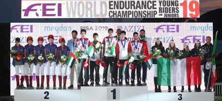 I primi a festeggiare sono stati i ragazzi della gara a squadre, nell'ordine Emirati Arabi Uniti, Spagna e Italia, salutati dagli applausi e dalle ovazioni di amazzoni e cavalieri degli altri team che hanno preso parte al FEI Meydan World Championship young riders & juniors 2019. Subito dopo ha preso forma l'apoteosi degli Emirati Arabi Uniti, che hanno occupato tutti i gradini del podio della gara individuale: medaglia d'oro per Saeed Salem Atiq Khamis Almuhairi, argento a Shaheen Yayhya Shaheen Khalfan Almazrouei e bronzo a Saif Ahmed Mohammed Ali Almazrouei.